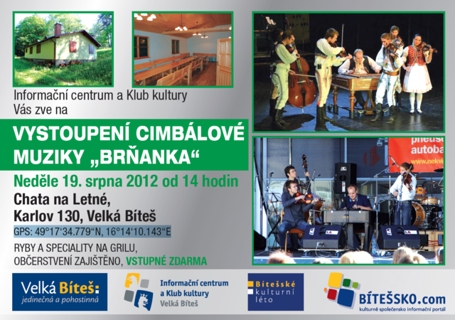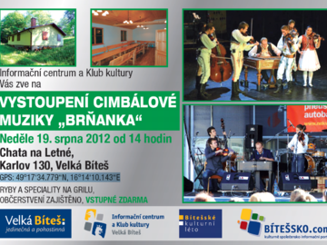 Informační centrum a Klub kultury Vás srdečně zvou na vystoupení CIMBÁLOVÉ SKUPINY BRŇANKA. Všechny milovníky cimbálu i folkové muziky uvítá v neděli 19. srpna od 14 hodin chata na Letné (Karlov 130).