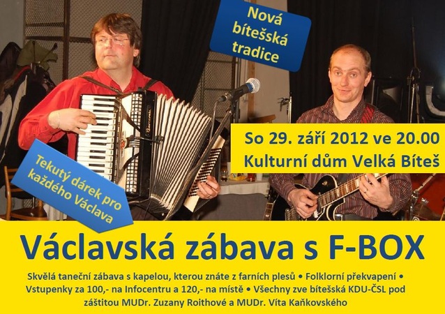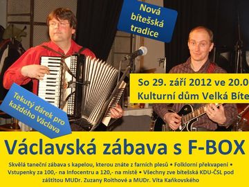 Populární kapela F-Box, která dokáže vyprodat bítešské farní plesy, se do Velké Bíteše podívá znovu v září. Vystoupí na premiérovém ročníku zábavy, která se uskuteční den po svátku sv. Václava, 29. září 2012 v Kulturním domě. Organizátoři chtějí dát Bítešským možnost dobře se pobavit, setkat se u sklenky vína a s drobným odstupem zavzpomínat na hody.