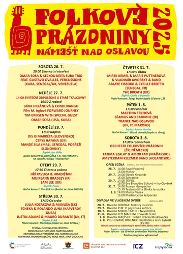 Festival world-music Folkové prázdniny v Náměšti nad Oslavou zvedne svoji pomyslnou oponu 26. července a skončí 2. srpna.