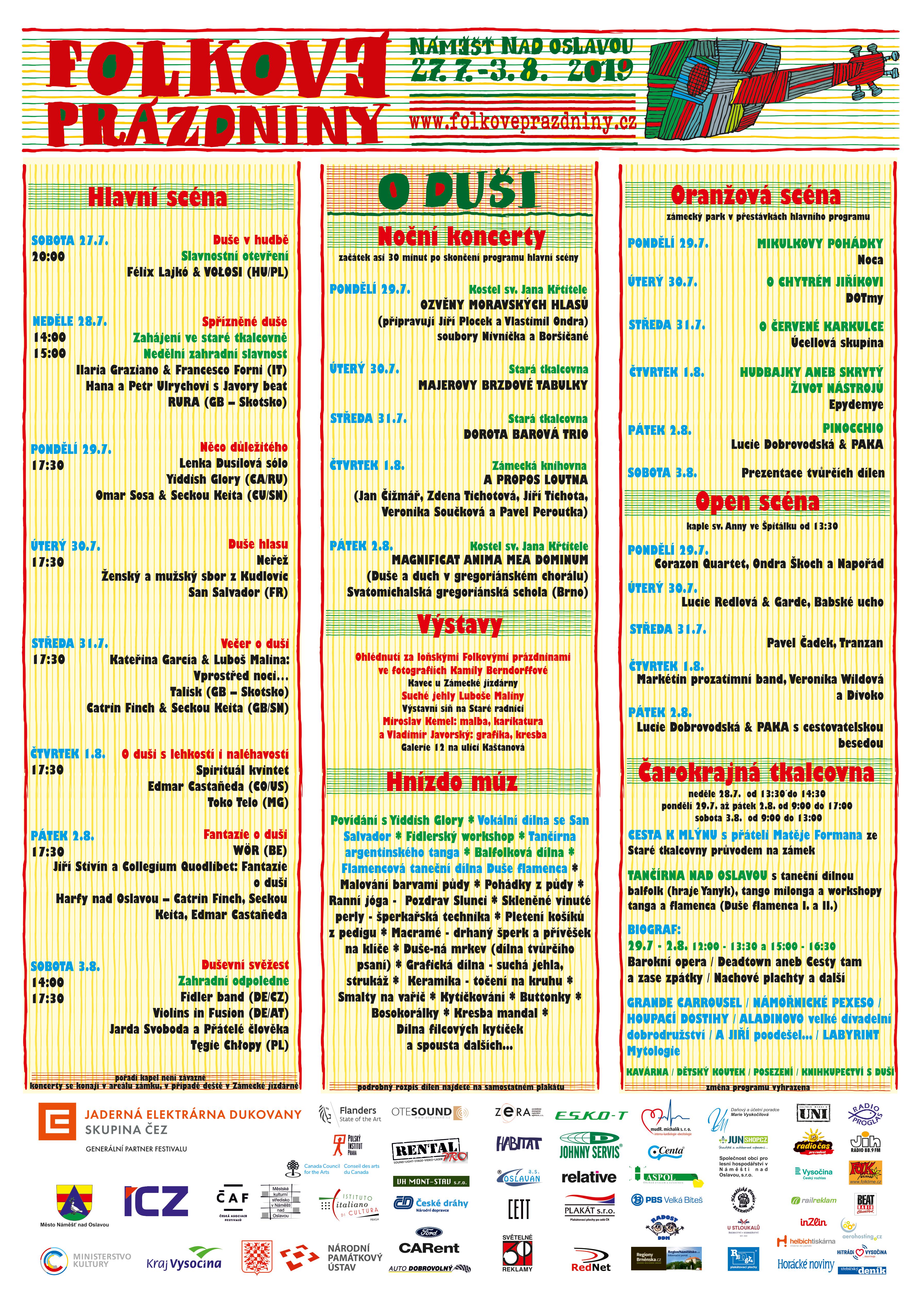 Vrcholem dne budou jistě tři večerní představení. Nejprve od 19:45 koncert Hany a Petra Ulrychových s Javory Beat, kterým je téma festivalu „o duši“ vlastní.
