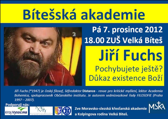 Bítešská akademie si získává dobré jméno díky volbě zajímavých osobností, jako byli biskup Václav Malý, astronom Jiří Grygar či lékař Vít Kaňkovský. „Jirka Fuchs je charismatický člověk a těším se na živou diskusi,“ říká Tomáš Lajkep z Kolpingovy rodiny Velká Bíteš, který besedu organizuje.