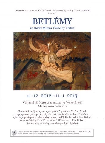 Velká Bíteš - Výstava betlémů s názvem "Beltémy ze sbírky Muzea Vysočiny Třebíč" se koná od 11. prosince 2012 do 11. ledna 2013 v malém sále Městského muzea ve Velké Bíteši.