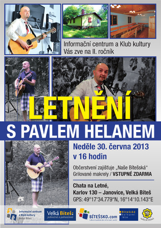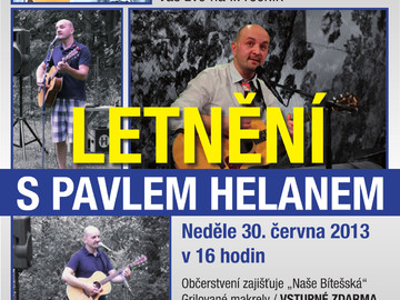 Již druhým rokem pokračuje Letnění s Pavlem Helanem. Po loňském příjemném koncertu nás i letos přivítá se svým repertoárem písničkář Pavel Helan, který je v Bíteši již dobře známou tváří. Akce se koná v neděli, 30. června od 16 hodin na chatě na Letné.