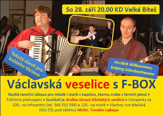 Velká Bíteš: Svátek sv. Václava ve Velké Bíteši již podruhé oslaví veselice v místním kulturním domě. Bítešští 28. září přivítají nejen velkomeziříčskou kapelu F-BOX, jejímž úkolem je řádně rozparádit publikum, ale i vzácné hosty z Německa.