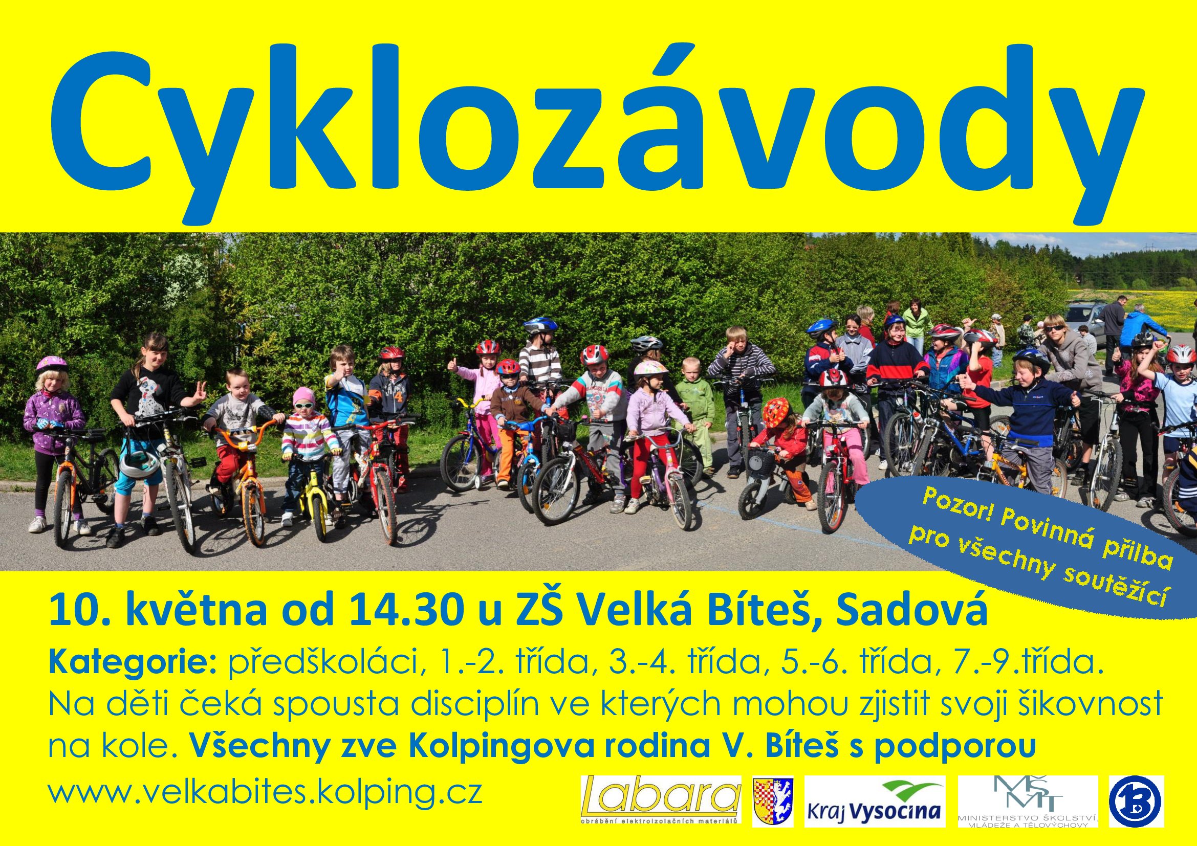 Již mnoho let si mohou bítešské děti vychutnat atmosféru pravých nefalšovaných cyklistických závodů. Letos se uskuteční v neděli 10. května od 14.30 u Základní školy na ulici Sadová. Soutěžit mohou již předškoláci na tříkolkách a dalších odrážedlech. Nejstarší účastníci na kolech pak budou žáci 9. tříd. Na děti čeká spousta disciplín, ve kterých mohou zjistit svoji šikovnost na kole. Pozor! Přilba je povinná pro všechny účastníky. Všechny zve Kolpingova rodina Velká Bíteš.
